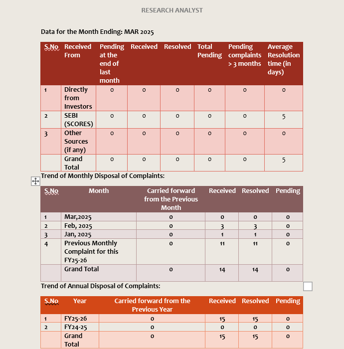 | 2 | SEBI (SCORES) | 0 | 0 | 0 | 0 | 0 | Within 30 Days |